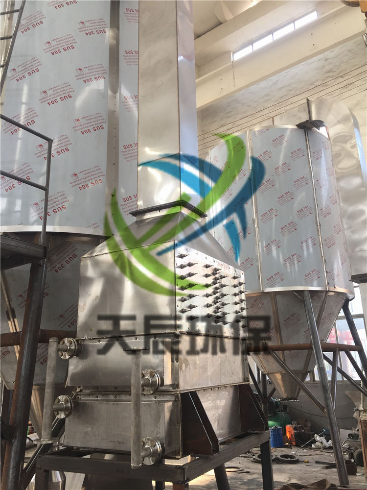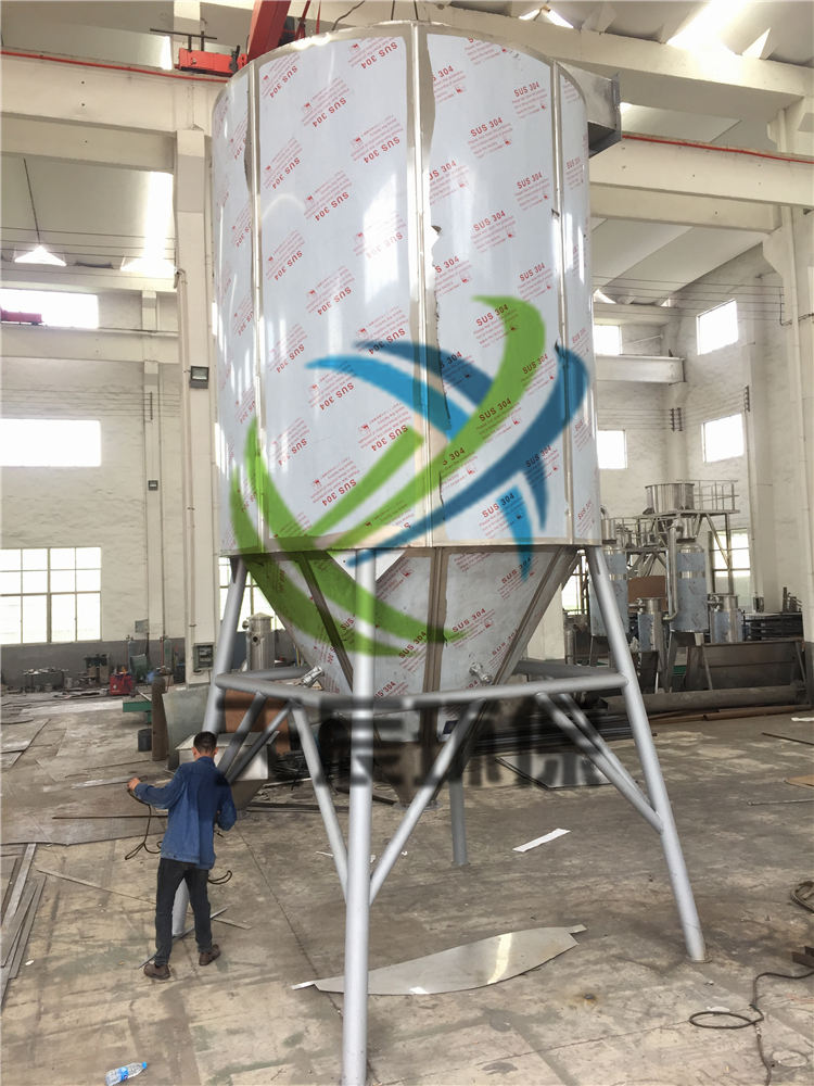 空氣經(jīng)過濾和加熱,進(jìn)入干燥器頂部空氣分配器,熱空氣呈螺旋狀均勻地進(jìn)入干燥室。料液經(jīng)塔體頂部的高速離心霧化器,(旋轉(zhuǎn))噴霧成極細(xì)微的霧狀液珠,與熱空氣并流接觸在極短的時(shí)間內(nèi)可干燥為成品。成品連續(xù)地由干燥塔底部和旋風(fēng)分離器中輸出,廢氣由風(fēng)機(jī)排空。