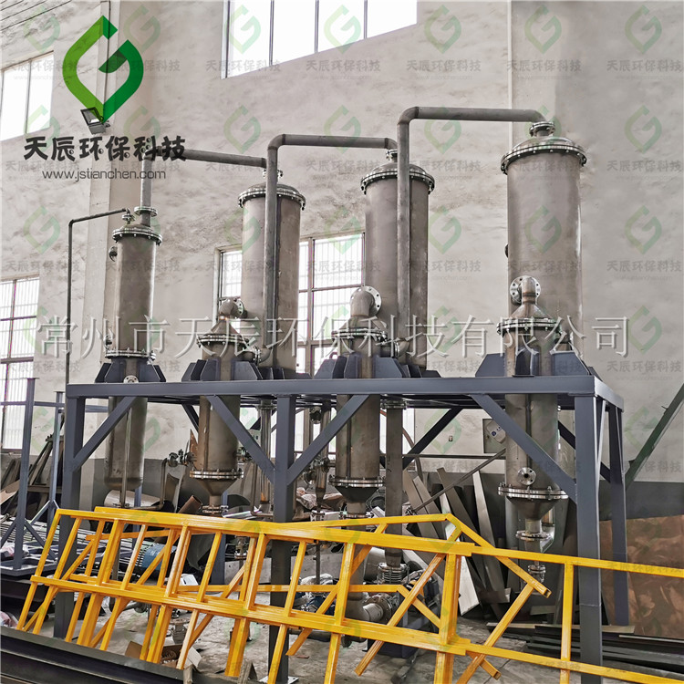 本設(shè)備由各效加熱器、各效蒸發(fā)分離器、冷凝器(混合式或表面式)、各效強制循環(huán)泵、各種料液輸送泵、真空泵、冷凝水泵、操作平臺、電器儀表控制柜及界內(nèi)管道閥門等組成。