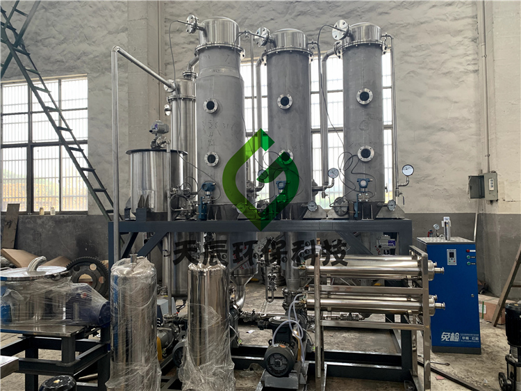 三效蒸發器在含鹽廢水的處理過程中,其含鹽廢水進入三效濃縮結晶裝置,有效的經過其設備冷凝的濃縮的結晶過程,分離為淡化水和濃縮晶漿廢液;無機鹽和部分有機物可結晶分離出來,焚燒處理為無機鹽廢渣。